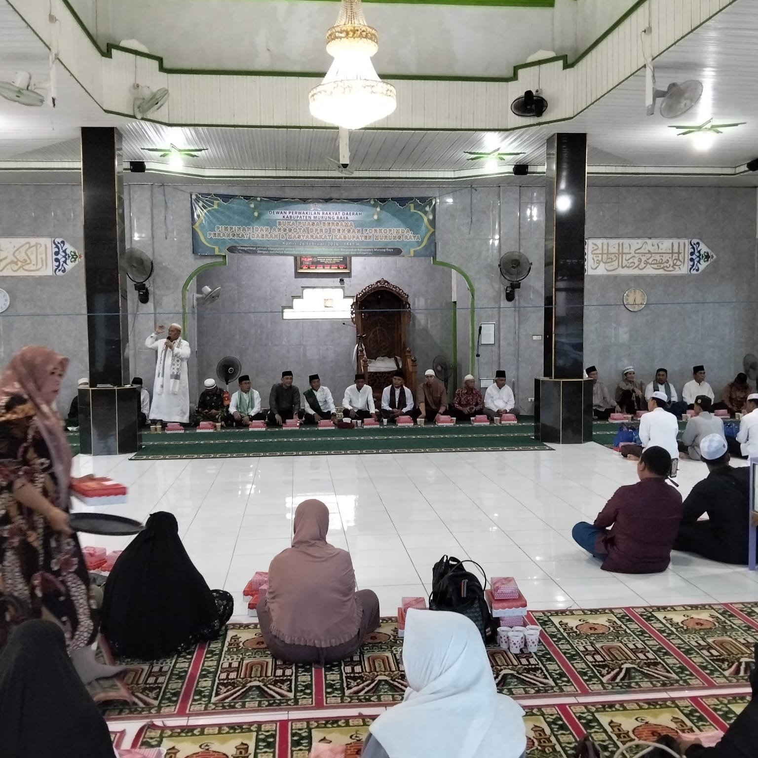 Kaltengpress.com, Puruk Cahu – Suasana hangat dan penuh kebersamaan menyelimuti Mesjid Jami Nurul Hidayah di Kelurahan Muara Laung I, Kecamatan Laung Tuhup, Kabupaten Murung Raya, pada Kamis (26/2/2026). Ketua DPRD setempat, H. Rumiadi, S.E, S.H, M.H, memimpin rombongan anggota dewan, staf, dan jajaran DPRD untuk menggelar acara buka puasa bersama tokoh agama, tokoh adat, serta tokoh masyarakat. Kegiatan ini menjadi momen istimewa di tengah hiruk-pikuk persiapan bulan suci Ramadhan 1447 Hijriah, di mana masyarakat Dayak setempat turut meramaikan dengan tradisi lokal yang kental.